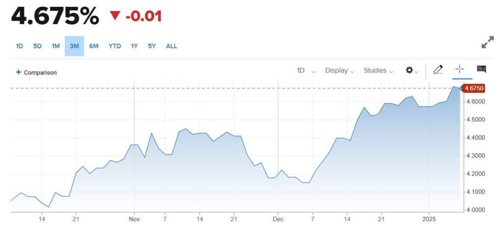 The 10-year treasury yield has held a consistent uptrend, rising from 4% in early October to 4.6% as of this Tuesday: