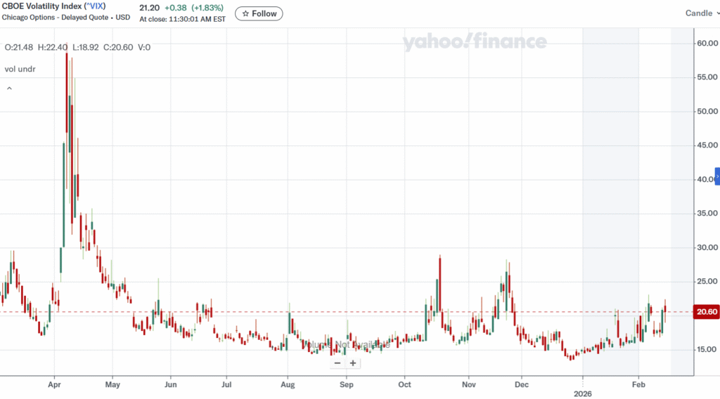 During the tariff scare in April 2025, the VIX hit 60. In 2020, during the pandemic crash, the VIX spiked to 82.