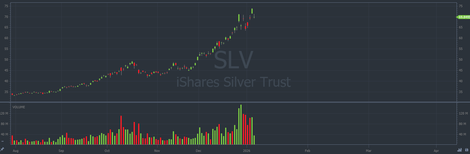 Spot silver itself recently touched $81 an ounce, its highest level in over four decades. In recent weeks, the volume on SLV exploded to more than three times its daily average.