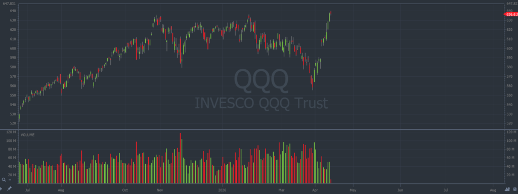Major indexes made new all-time highs again yesterday. There’s a chart of the QQQ below: