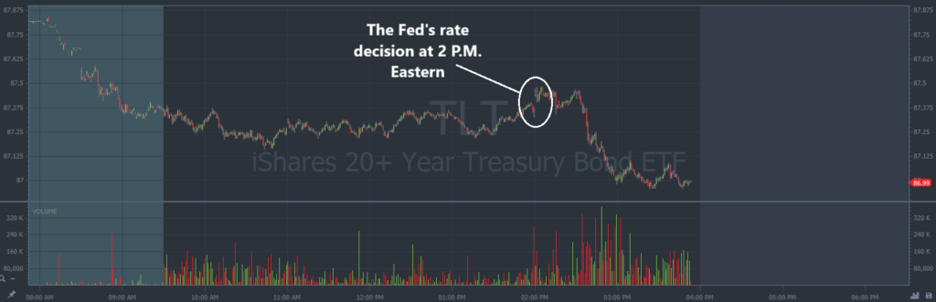 Look at the immediate reaction on TLT’s chart after the Fed announcement at 2 P.M. Eastern yesterday: