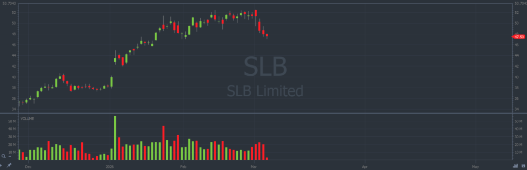 Here’s SLB’s recent price action as it fades below the 52-week highs: