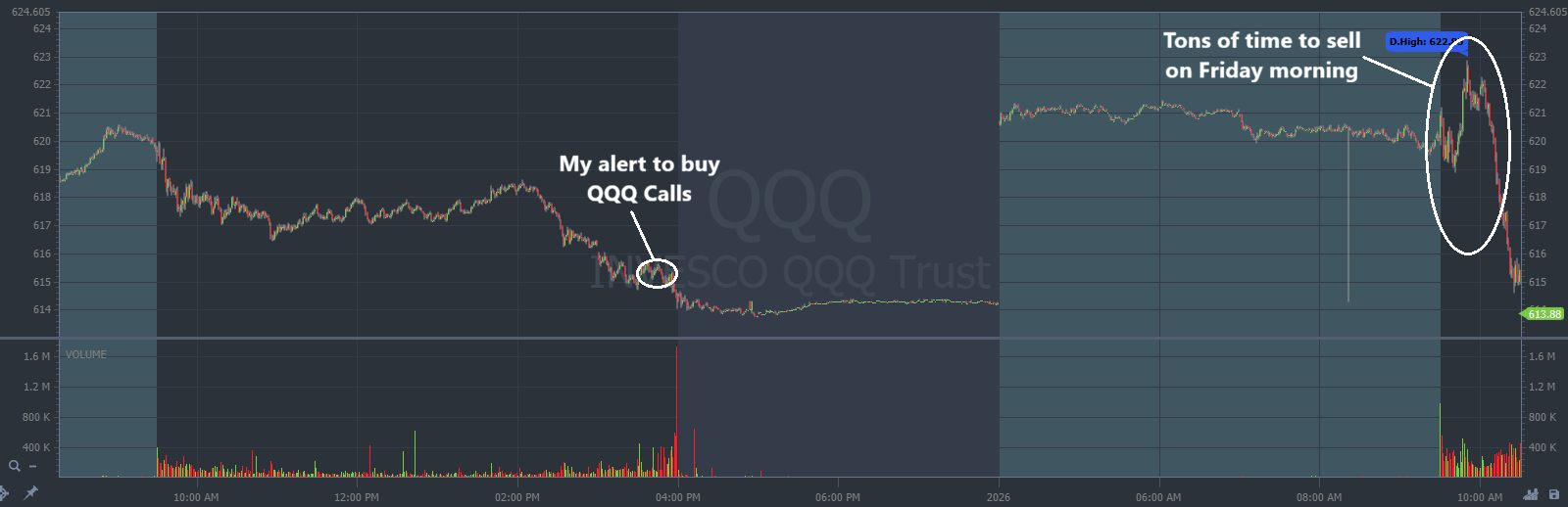 My alert is overlaid on the QQQ chart below. Every candle represents one trading minute:
