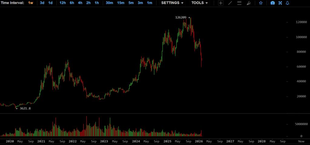 On the Bitcoin chart below, every candle represents one trading week