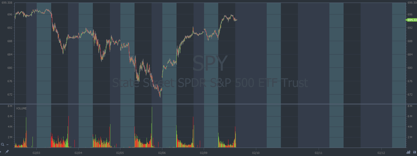 On the SPY chart below, every candle represents five minutes: