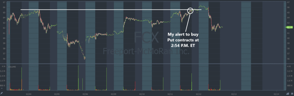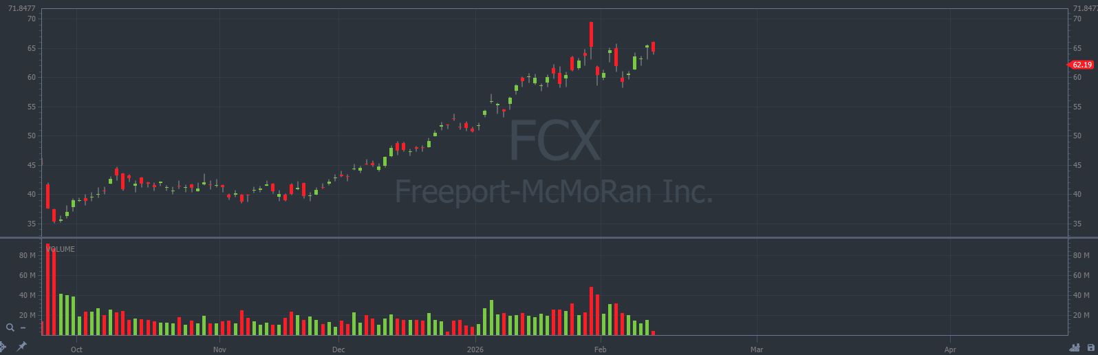FCX hit an all-time high of $69.44 on January 29, rode copper prices to record levels above $6.11 per pound, then dropped alongside SLV when the precious metals sector imploded on January 30.