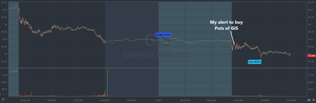 General Mills Inc. (NYSE: GIS) hit new 52 week lows on January 5. Going into January 6, I was looking for a continuation of that momentum.
