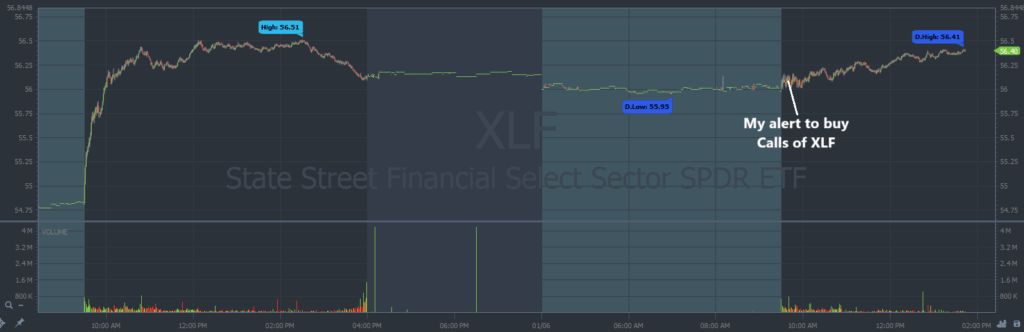 The chart shows XLF bounced less than 1% on January 6.