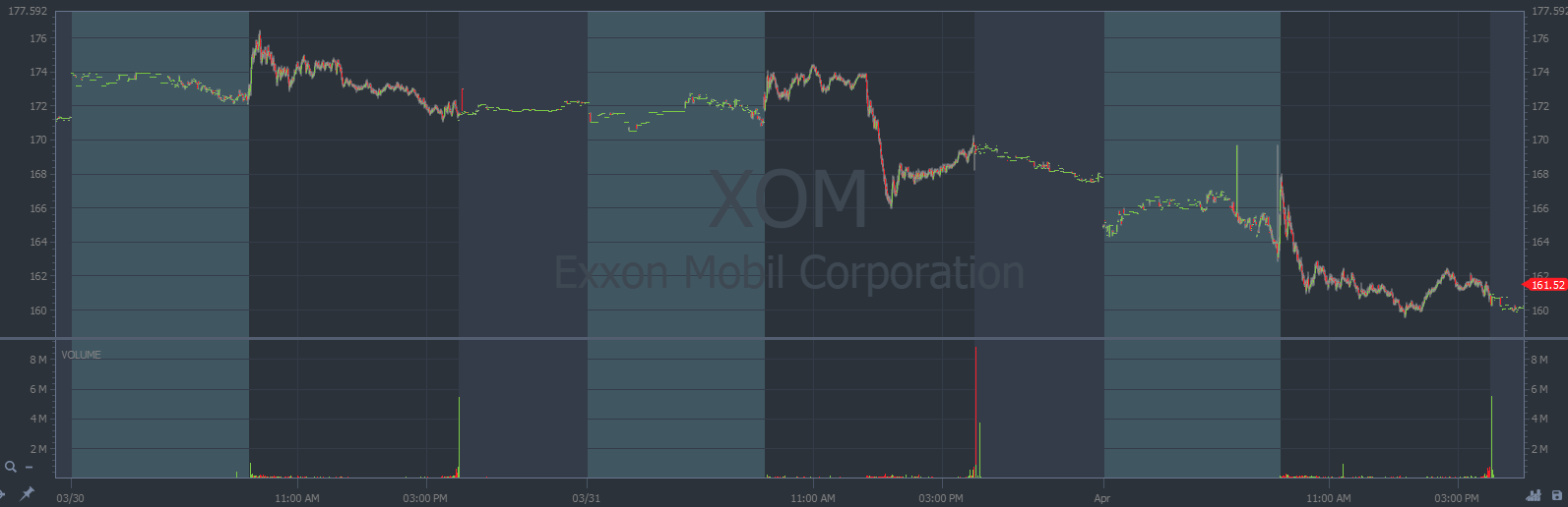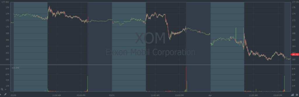 XOM chart multi-day, 1-minute candles Source: StocksToTrade